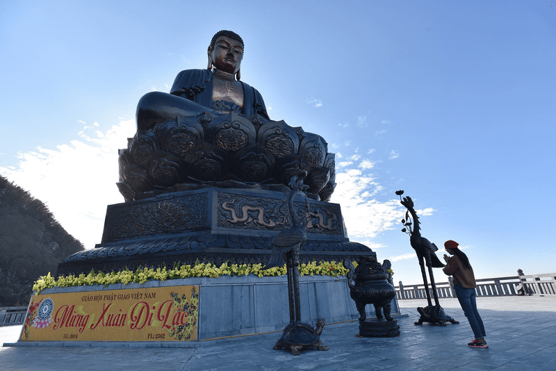 Góc máy: Người chụp hãy đứng ở bậc thang phía dưới xa, chụp hất lên. Cách này sẽ lấy được toàn bộ vóc dáng uy nghi của bức tượng và sự nhỏ bé, khiêm nhường của con người trước thiên nhiên, phật pháp.