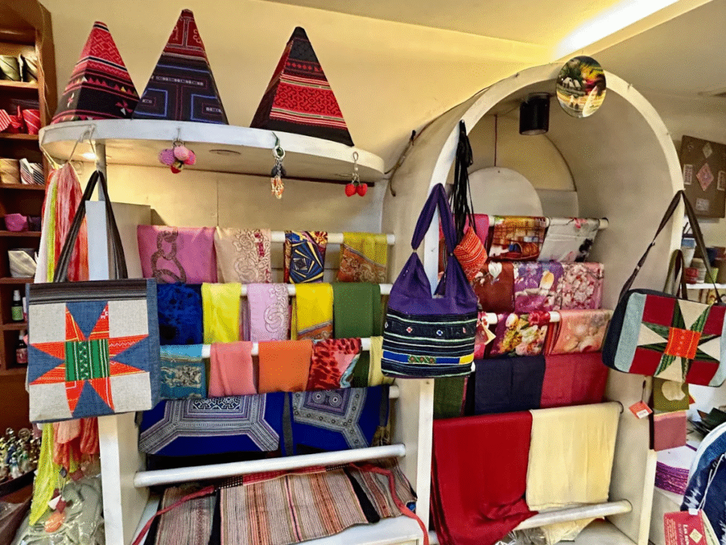 Những tấm khăn, túi xách hay ví được thêu tay tỉ mỉ bởi các nghệ nhân dân tộc Mông, Dao. Mỗi họa tiết đều kể một câu chuyện về đời sống văn hóa vùng cao, là món quà lưu niệm bền vững và ý nghĩa.